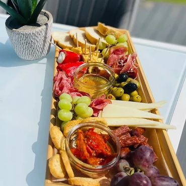 You will find a selection of cured meats, cheeses, breads, crostini's, houmous, pasta, vegetables & fruits,